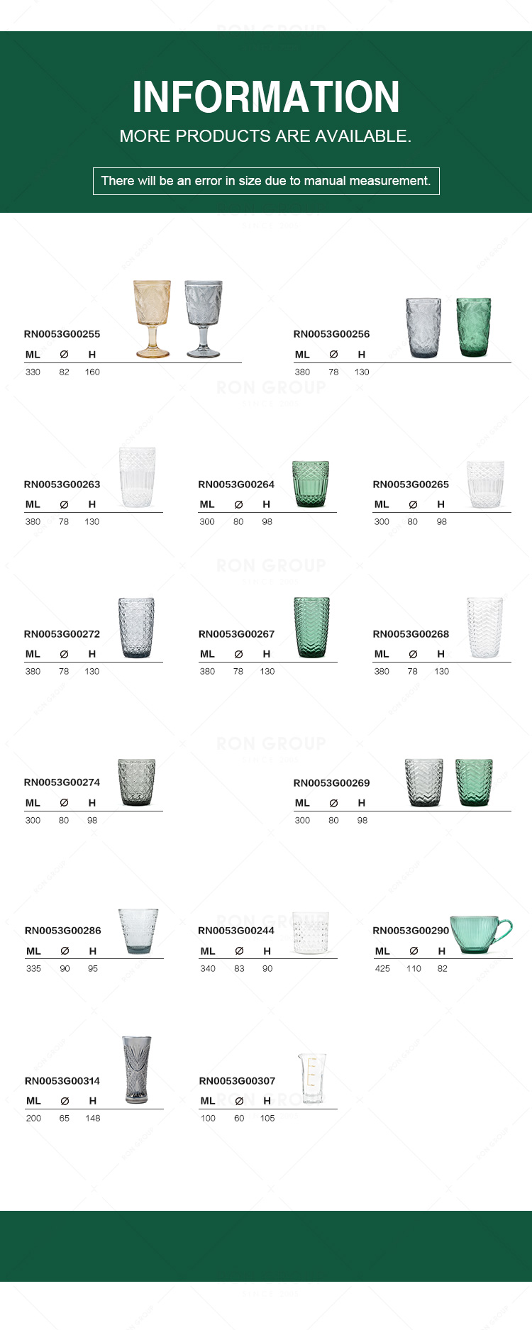 Product Fine Dining Fine Dining White Unique Fambe Cobble Stone Matte Color Frosted Slate European Style Tableware Sri Lankan Serenity Azure Moonlit Collection Chip Proof Porcelain Pure White Ginger Lake Blue Ocean Blue Tomato Red Blue Viridis Indian Red White with Dot Frosted Black Frosted White Misty White Bule Cream White Apple Green Morandi Custard Matte White Matte Black Rattan Flower Dark Grey Series Hand Drawing Craft Rattan Flower Hand-painted Plate Hand Drawing Collection Customized Hand-painted Ceramic Plate Wedding & Event Wishing Collection Rome Fantasia Bead Edge Frosted Gold Wedding Glass Charger Gold & Silver Plating Series Asian Style Rainbow Novelty Season Black Dot Pastorale Sunset Red Fence Blue Scene Fine Rain Ink Dye Elegant Peony Clear River Matte Black Tai Chi Wind&Wave Sailed Blue Line Cymbidium Series Star series Lotus Bowl Premium White Porcelain Sakura Green 9 Series Ceramics Terracotta Simplicity Zentangle Art Craft Japanese Terracotta Pot Series Fish Pattern Jasper Leaf Autumn Leaf Matcha Green Pomegranate Frosted Obsidian Black Shadow Mystic Orchid Blue Terracotta Pot Durable Melamine Golden Lip Wood Grain Black series Ancient Wood Grey Stone Terracotta Brown Series Plain Ring Brown and Black Rock Grey Melamine Texture Melamine Korean Charcoal Stone Melamine Series Ebony Coffee Melamine Serie Drinkware Classic Tempered Crystal Gold Rim Plastic Ceramic Wedding Glass Glass PC Cutlery Black MultiColor Silver Gold Rose Gold Wood chopsticks Buffet Stainless Steel Charger Placemat Basket Wooden Pallet Outdoor Furniture Outdoor Umbrella Bone China Pure White Bone China Gradient Color Decorating Plate Barware Ice File Disposables Bowl Aluminum Box Cornstarch Lunch Box Customized Disposables RonGroup New Color Rattan Flower Chip Proof Porcelain Collection - Ceramic Dinnerware Triangular Narrow Plate RonGroup New Color Rattan Flower Chip Proof Porcelain Collection - Ceramic Dinnerware Trigon Plate Glass RN0053G00256 Hot Selling High Quality Exquisite Glass Cup Share it: Product Model RN0053G00256Product Application Restaurant,Bar,Home,Hotel,GiftProduct MaterialGlassMin Order QuantityPls contact salesman for more detail.Payment TermsT/T, 30% deposit, 70% balance payment Delivery Time30-35working days POPULAR PRODUCTSYOU MAY ALSO LIKE RN0053G00255 Hot Selling Unique Design Exquisite Glass Cup RN0053G00244 Wholesale Simple Design Safe Non-toxic Glass Cup RN0053G00241 Hot Sale High Quality Beautiful and Durable Glass Fruit Plate